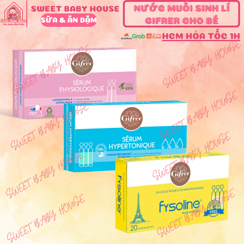 - Nước muối sinh lý Gifrer (Tép xanh): dùng trong các trường hợp nghẹt mũi (tắc nghẽn/sung huyết, phù nề niêm mạc, viêm xoang, viêm mũi…).